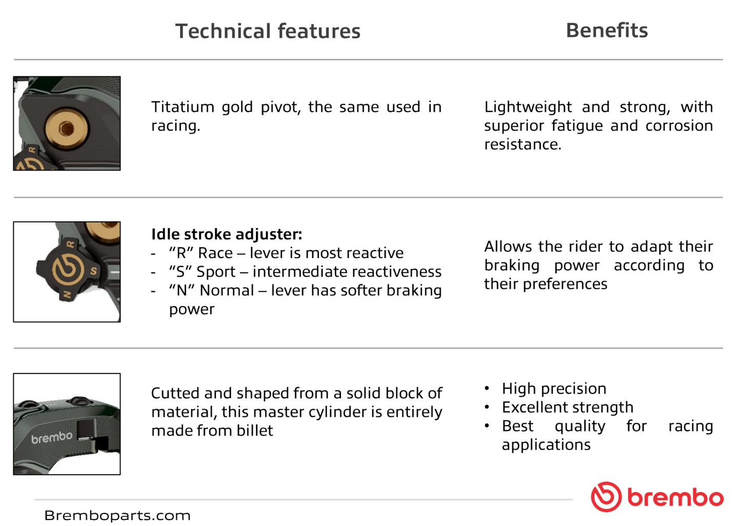 - Lever ratio: 18/20mm variable - Irregular stroke can be adjusted to 3 stages - Overhaul possible - Genuine Brembo product made in Italy.